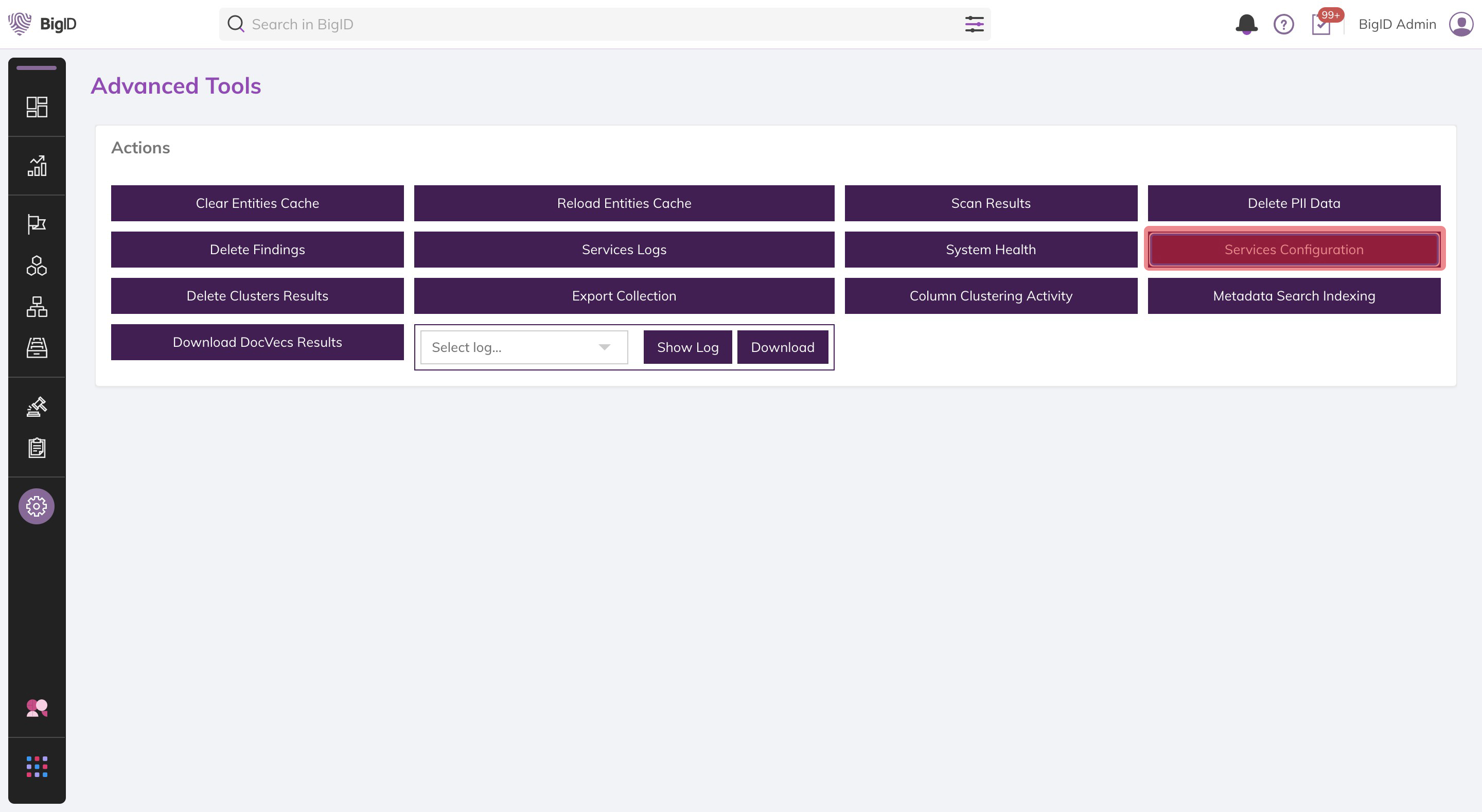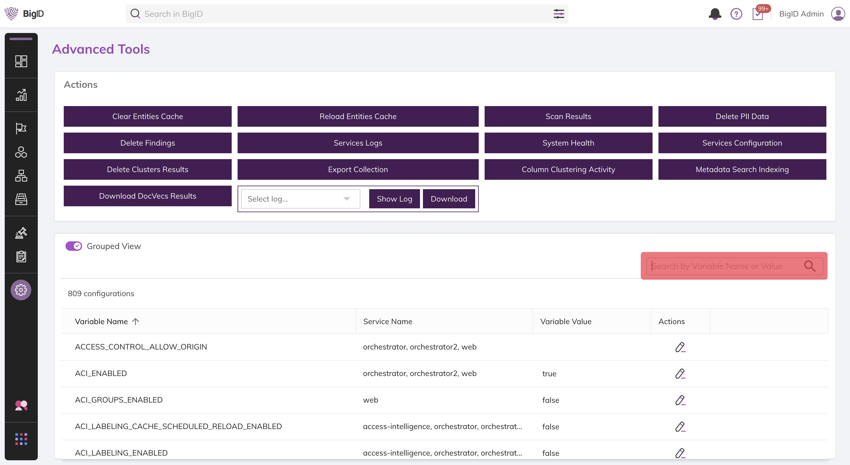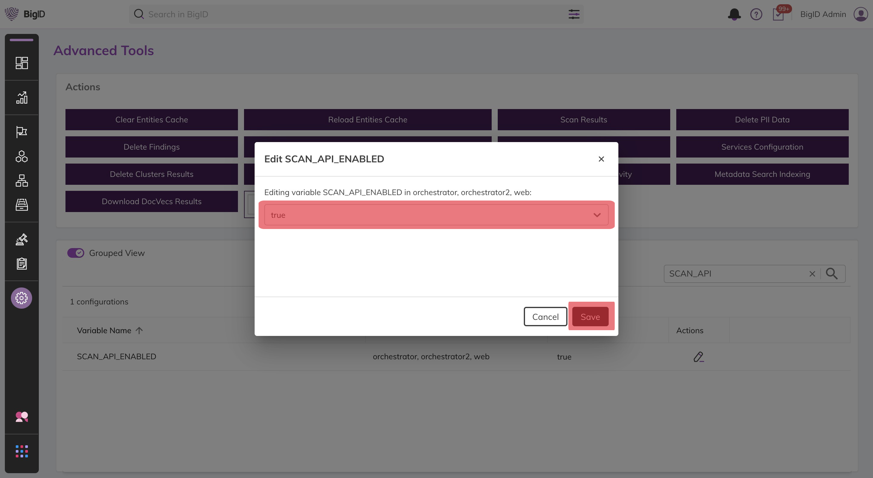 Section titled “Enabling the Scan Payload API”Because the scan payload API allows your BigID system to scan arbitrary pieces of data, it requires an environment variable to be set. Environment variables can be set in the Advanced Tools screen located in Administration -> Advanced Tools. The scan payload API also requires the bigid-confluent service to be enabled during installation.